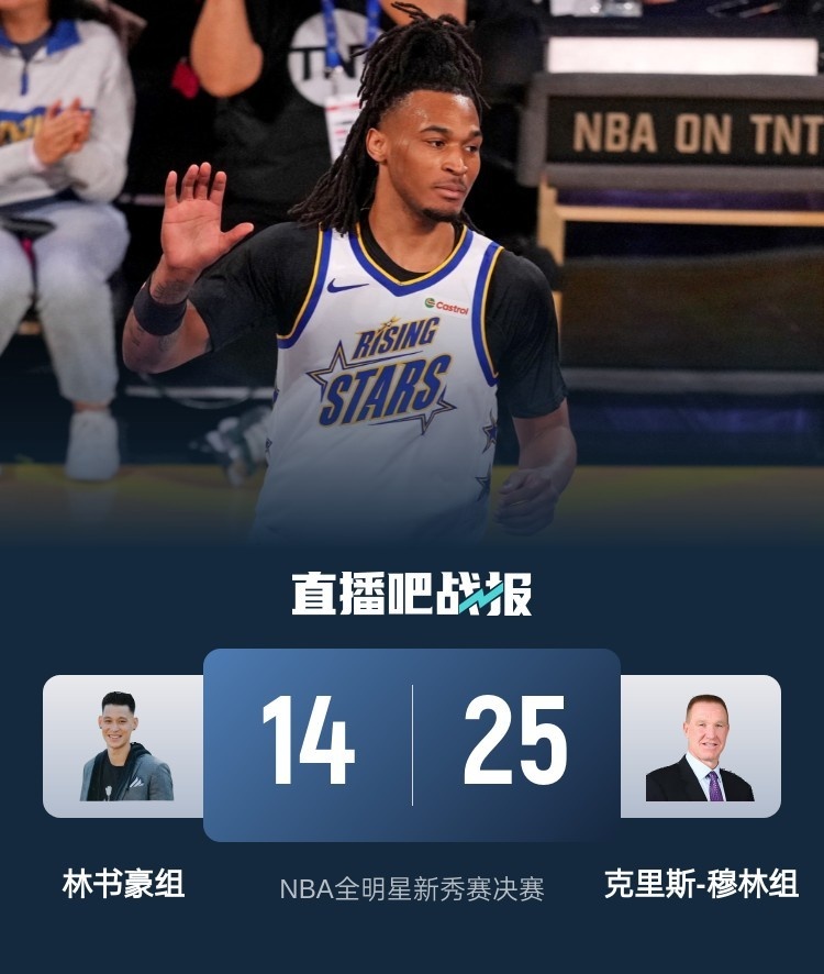 比赛开始,双方迅速进入状态,埃迪补扣为穆林组拿到首分,卡斯尔也是连续突破上篮;而佩特里突外投强势回应,米勒追身三分帮助林书豪组取得4分领先。暂停回来,卡斯尔接连补篮,瑞安-邓恩三分再进反超比分,随后克内克特里突外投连砍5分助穆林队拿到赛点,乔治追身三分拿到胜利,最终穆林组25-14力克林书豪组,拿到冠军,将在后天的全明星正赛上对阵奥尼尔组!